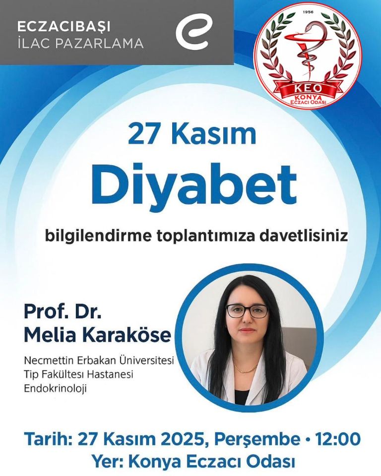 Eczacıbaşı Firmasının düzenlediği “Diyabet” konulu toplantı 27.11.2025 Perşembe günü saat 12.00-13.00 arasında yapılacaktır.