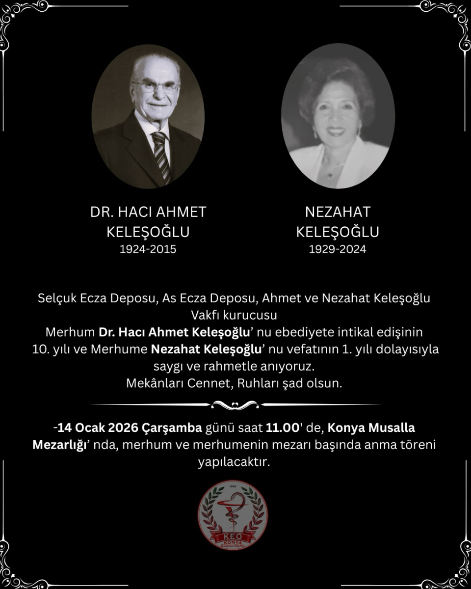 Merhum Dr. Hacı Ahmet Keleşoğlu’nu ebediyete intikal edişinin onuncu yılı ve Merhume Nezahat KELEŞOĞLU’ nu vefatının birinci yılı dolayısıyla saygı ve rahmetle anıyoruz.