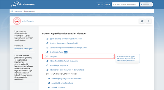 4) E-devlette sunulan "İçişleri Bakanlığı Hizmet Listesi" görüntülenir. Bu hizmetler arasındaki "E-başvuru" bağlantısına tıklanır. E-belge başvuru süreci başlar.
