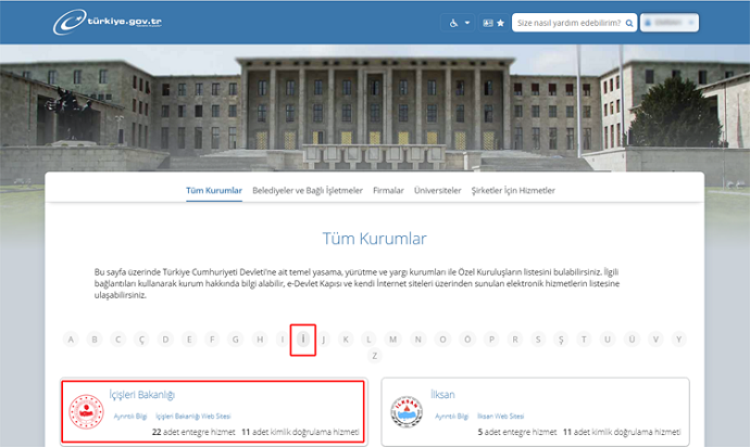 3) Kurumlar Ekranında "İ" harfine tıklanır. "İçişleri Bakanlığı" bağlantısı görünür. "İçişleri Bakanlığı" bağlantısına tıklanır.